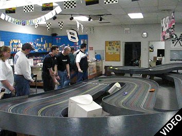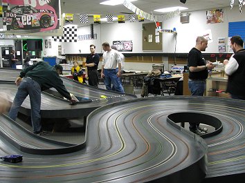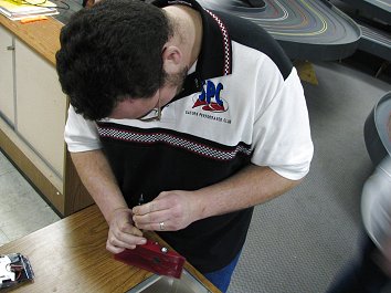 Running the cars wide open will result in frequent off-track excursions. When the track is several feet from the floor and from the walls, this can be hard on the cars. Here we see Deebs performing some maintenance on his car.