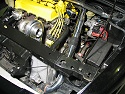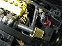 The outlet of the intercooler on the driver's side connects to the elbow entering the engine compartment. A small amount of the spaceframe's metal support needed to be trimmed next to the radiator to allow the pipe to pass. Note the use of a hump hose connector. Since the engine moves slightly on its mounts but the intercooler will not be able to move, the hump connectors provide a little bit of give. |