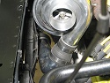 A 2.5" to 2" reducer was used to connect the compressor outlet of the turbo to the pipe that angles downward toward the passenger side of the car. Note the tight clearance between the fans and the turbo downpipe (visible behind the clamps on the silicone coupler). Not much space to work with. |