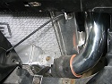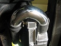 The 180 connects to the intercooler inlet on the passenger side of the car. In the photo, you can also see the brackets which connect the intercooler to the car's bumper support. In the interest of recycling and saving money, the brackets were made out of the tubes that make up the car's inner door reinforcement bars that I had pulled out of my parts car (see it HERE). |